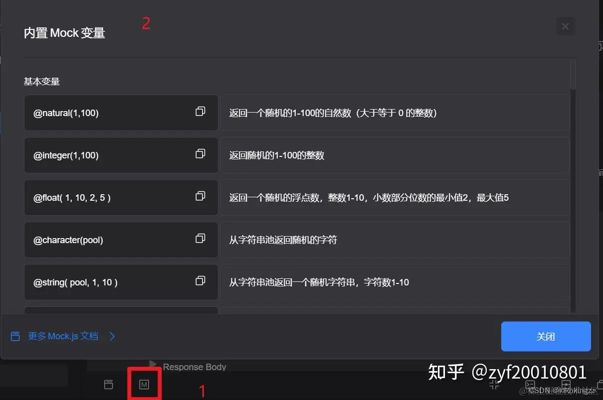 Mock参数设置也是实际接口测试中经常需要用到的一个功能,最典型的就是在请求接口时传入当前的时间戳,或者一些随机数。如下图操作即可看到内置Mock变量列表。