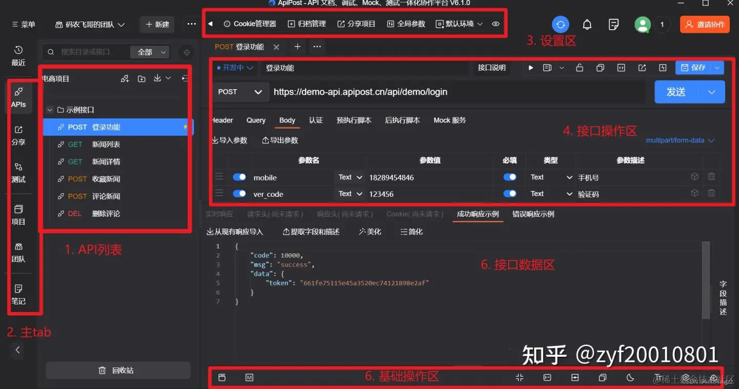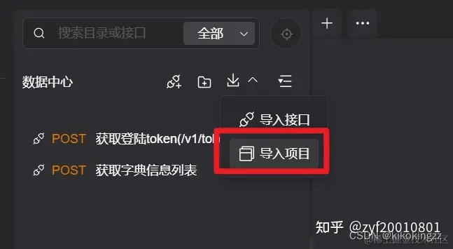 (1)API列表区:在这个区域我们可以新建接口,新建目录,导入接口以及项目,并且可以查看当前项目下的接口列表。