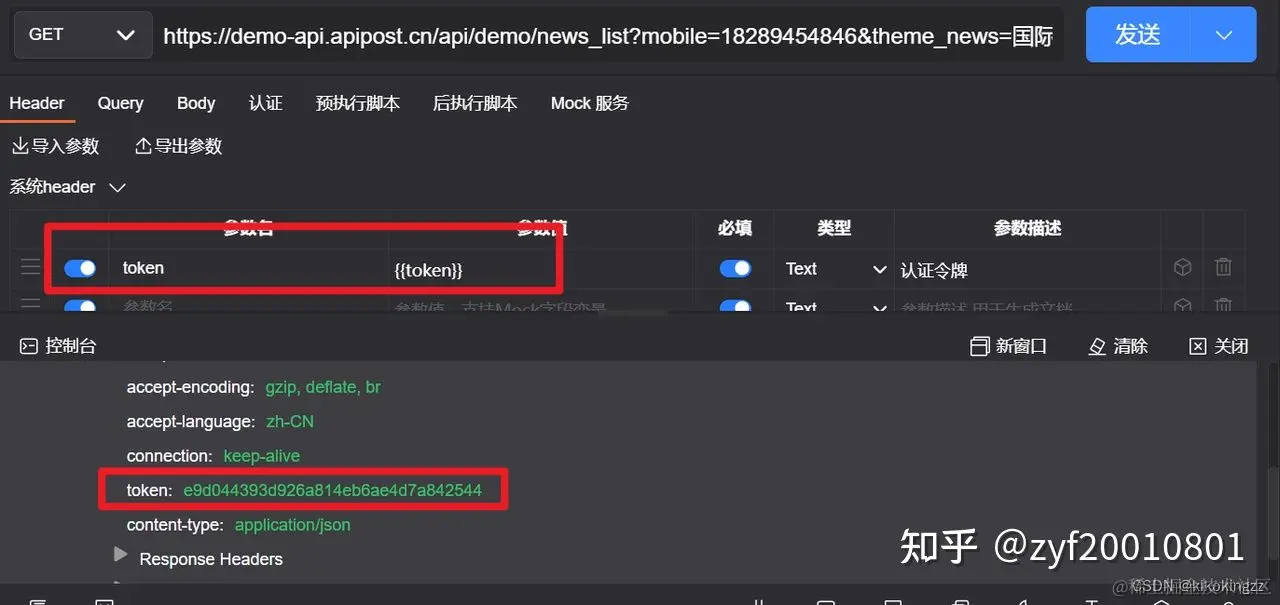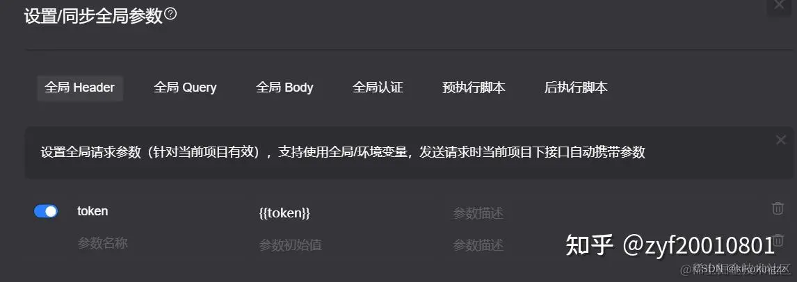 需要使用全局变量时则需通过占位符{{token}}来接收这个全局变量的值,既可以在单个接口的请求头中设置,也可以在全局参数中进行设置。