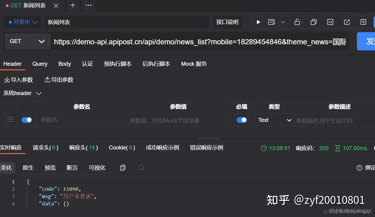 1.如下新闻列表接口,在没有传入token参数之后,直接请求该接口会提示用户未登录。