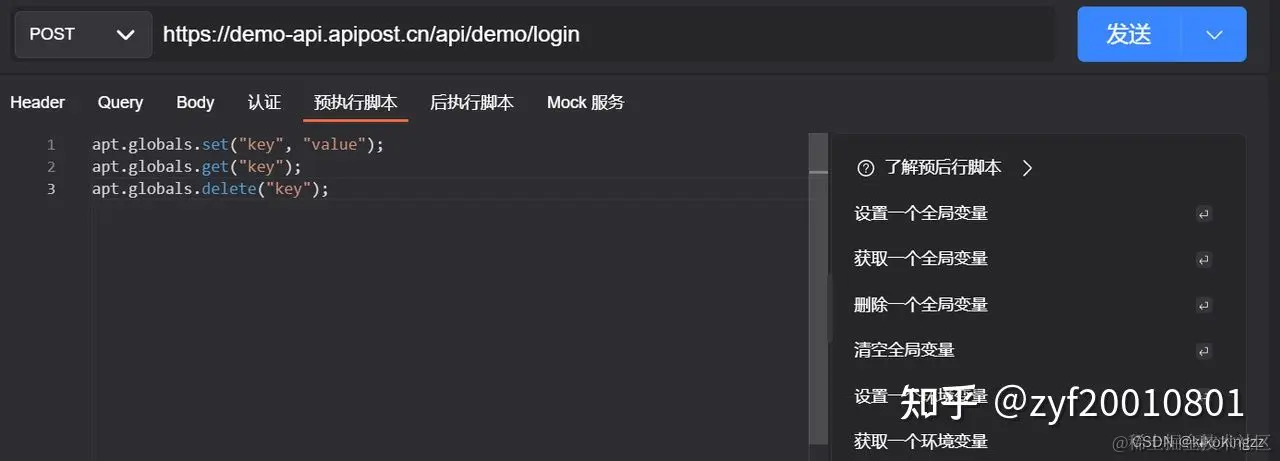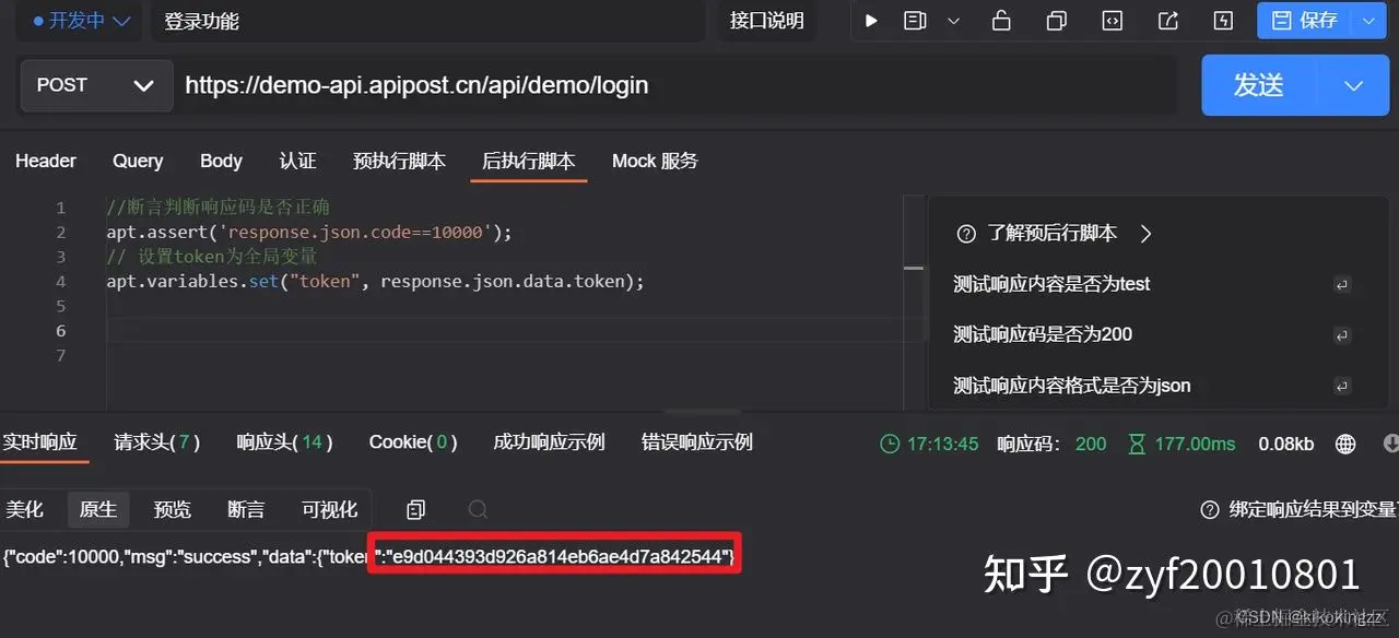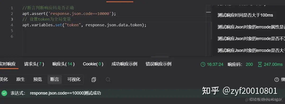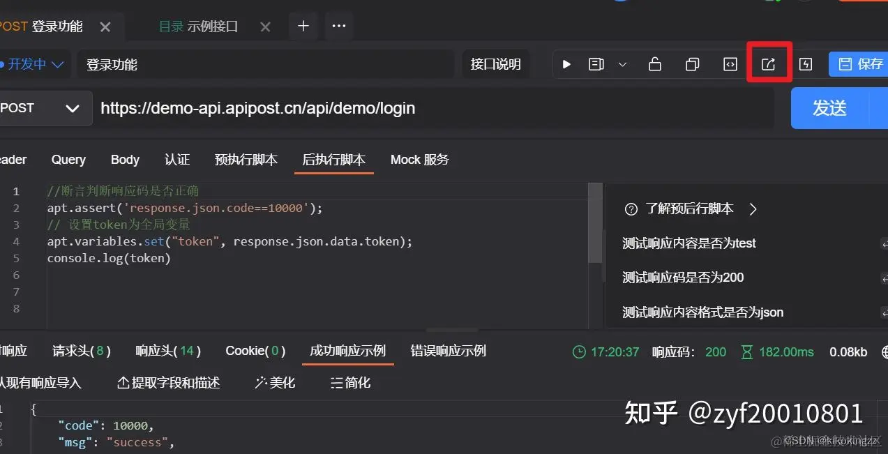 后执行脚本原理上与预执行脚本一致,不同的是它是在接口请求之后执行的。它主要用于设置断言脚本以验证测试用例。同时它还可以用于接口参数依赖的场景,比如业务接口需要获取登录接口返回的token,这时候就可以在登录接口的后执行脚本中获取接口响应的token,并设置token为全局变量。