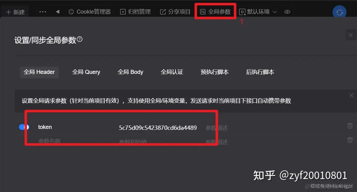 实际开发中同一个项目的一批接口一般都有一些公共的请求参数。比如常见的token参数,项目下的每个接口(除登录接口外)请求时都需要在head中带上token参数,如果我们在每个接口上添加就太麻烦,这时候我们就可以设置一个全局的token参数。