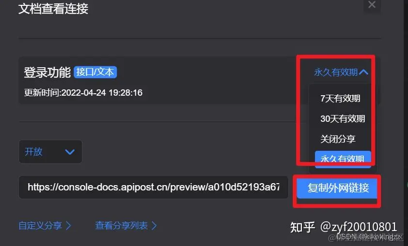 进入接口文档的分享窗口后,复制外网链接在浏览器上打开即可预览接口文档,在分享时我们可以选择文档的有效期,当然,只能在线预览接口文档还是远远不够的,Apipost还贴心的推出了接口文档导出功能。此刻我只想说:听我说,谢谢你,因为有你,温暖了四季。