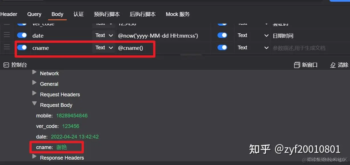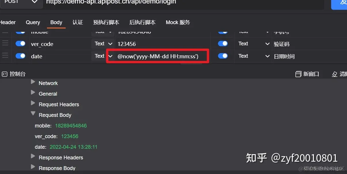 这里我选择了一个日期的Mock变量,再次点击发送请求,点击控制台按钮,找到那个请求,查看Request Body即可看到设置的随机date参数。