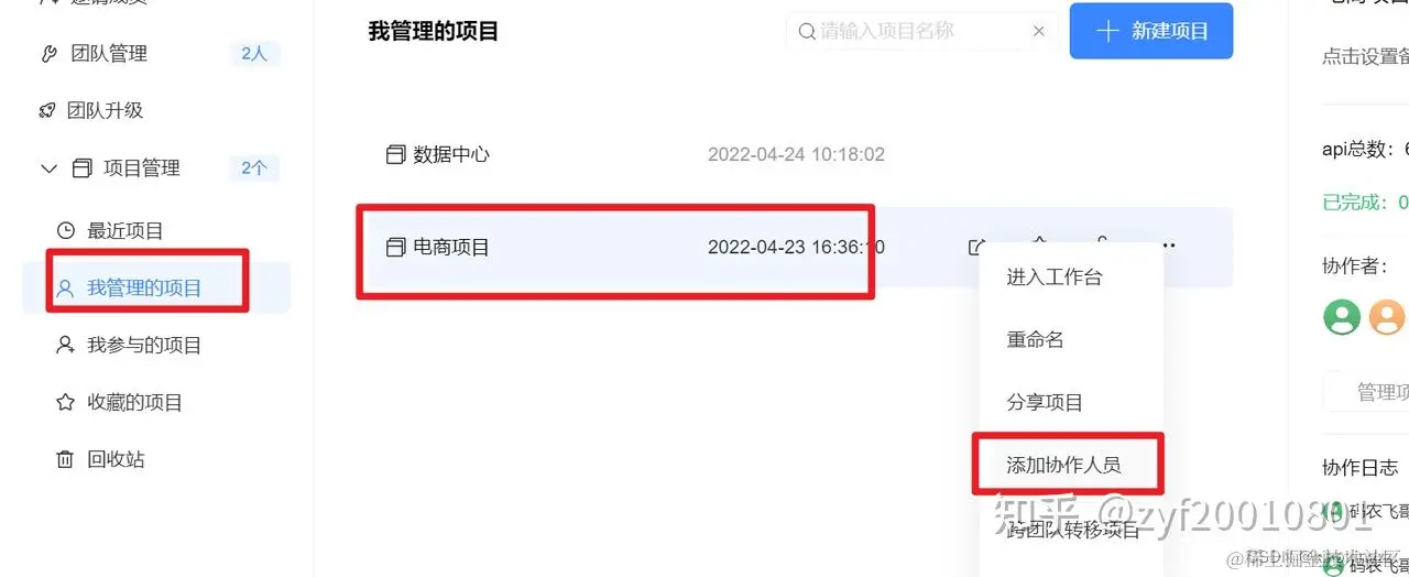 当然,我们也可以在项目管理里也可以添加协作人员,需要注意的是,如果不把协作人员加入到某项目中,那么该协作人员是看不到该项目的。