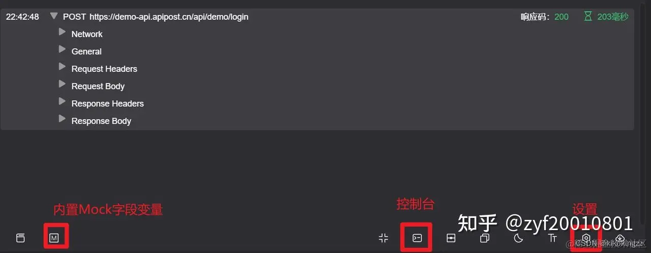 (6)基础操作区:这个区域最常用的就是内置Mock字段变量以及控制台功能,当然也可以进行一些设置操作。我们可以在设置窗口中设置代理,添加CA证书,进行发送设置等操作。