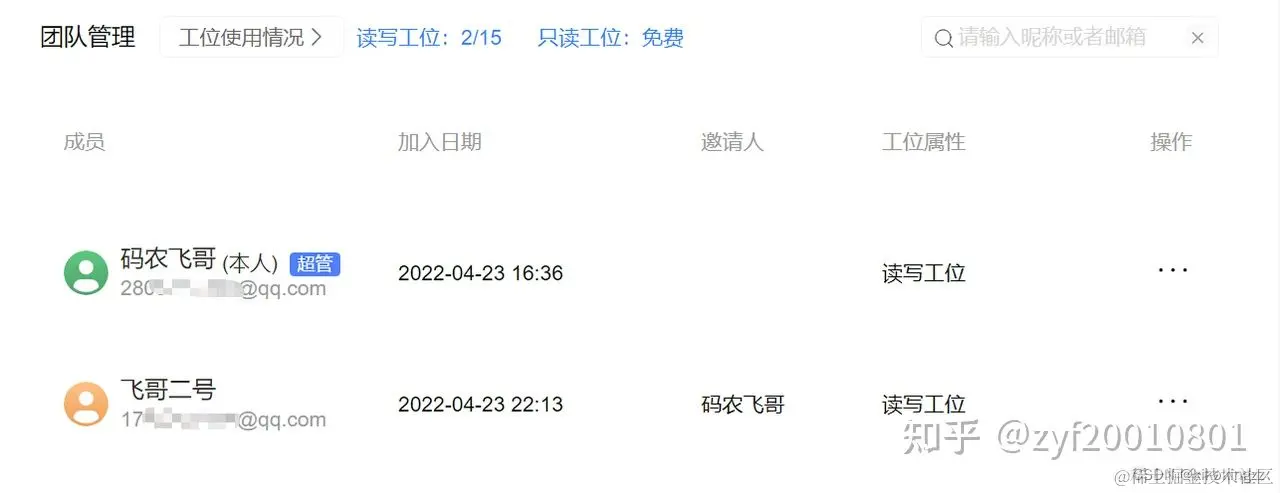 邀请完成之后就可以在团队管理里看到被邀请的协作人员。被分配的协作人员权限可以是读写权限(读写工位),也可以是只读权限(只读工位)。
