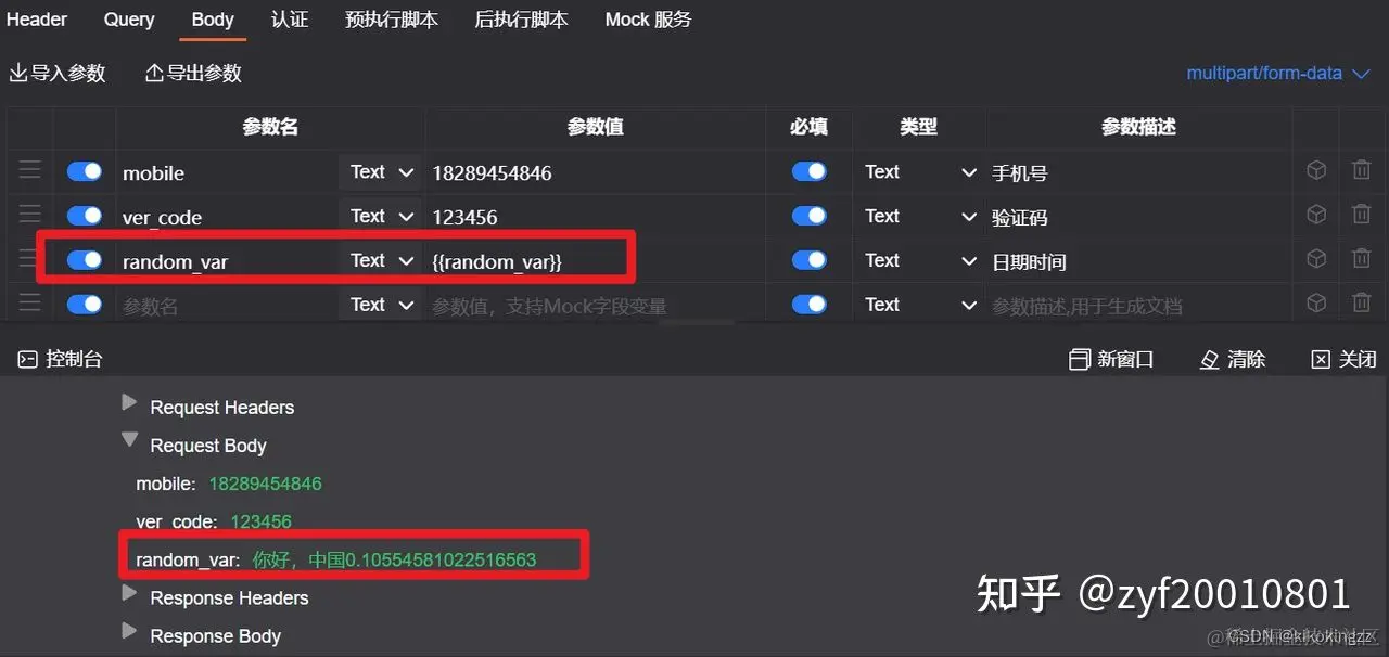 如下我定义了一个名为_random()的 js 函数,并定义了一个全局变量 random_var,然后在请求参数中定义设置该全局变量,发送请求后的结果如下图所示: