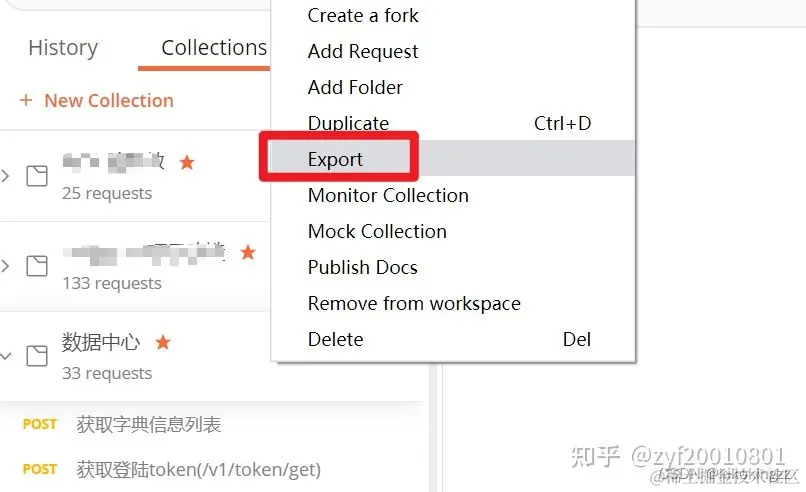 1.在postman上选中项目,右键,选中 Export 按钮导出项目。