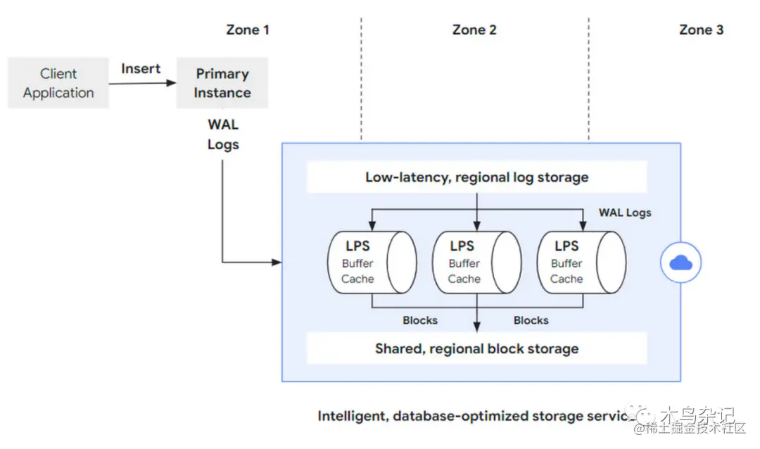 即,AlloyDB 将其存储层进一步拆分为两个存储层和一个计算层,以拆解复杂度: