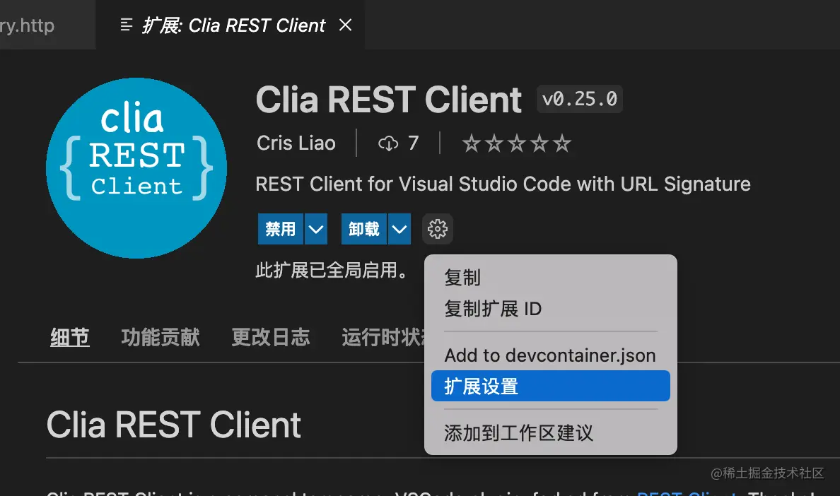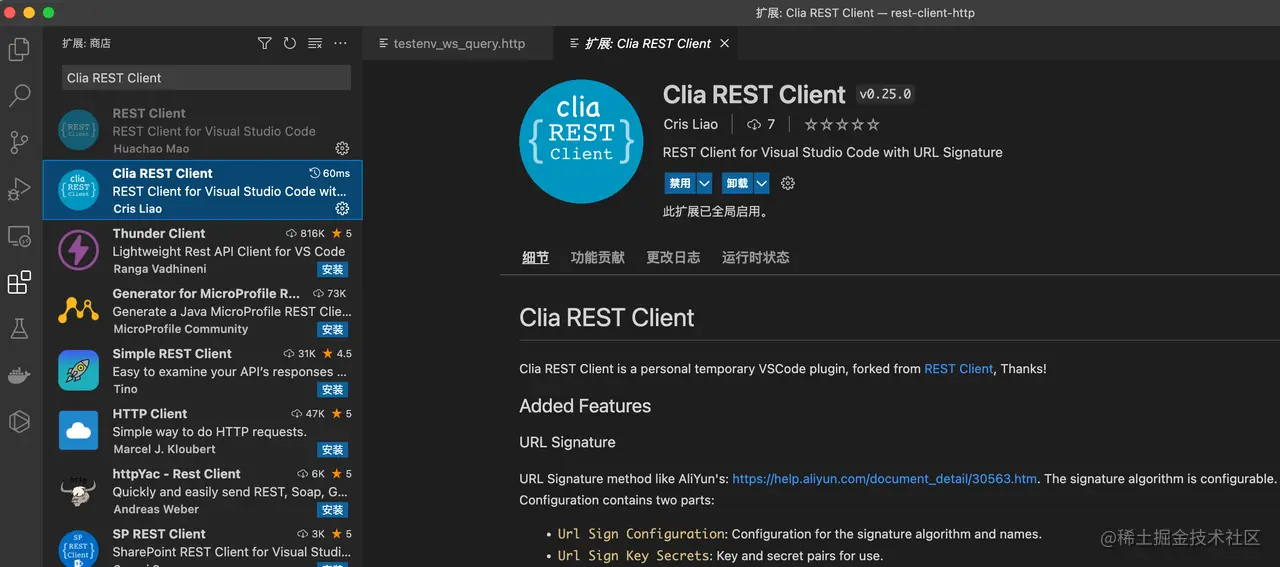 - 打开 VSCode,如上图所示,在左边选择插件栏,搜索 “Clia REST Client”,在右边点击 “安装” 按钮进行安装。