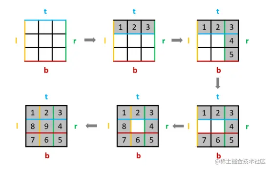 - 需要想好每次填充时for循环内的控制变量应该怎么写,每次缩小边界时应该怎么变
