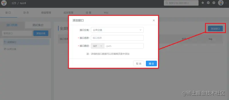 有的读者已经迫不及待了!下面用一个简单例子来入门YApi,在项目里新建接口,这时会弹出一个窗口,几个选项都很清楚,接口路径是什么?这是方便前端调用后端,而设置的接口路径: