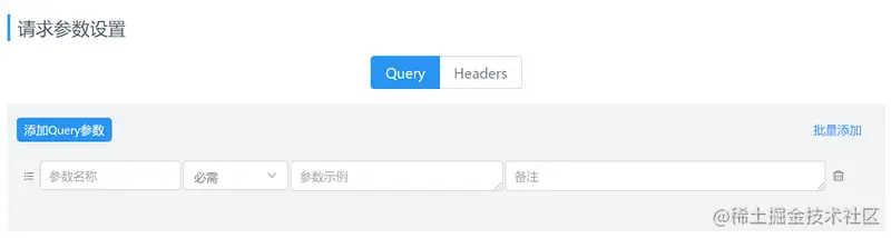 Query参数:接口 url 的查询字符串。点击『添加Query参数』按钮来添加参数,可以通过拖动来交换参数位置