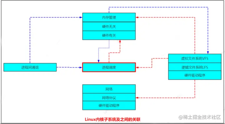 3、Linux内核抽象结构。由5个主要子系统组成,具体架构如下图所示: