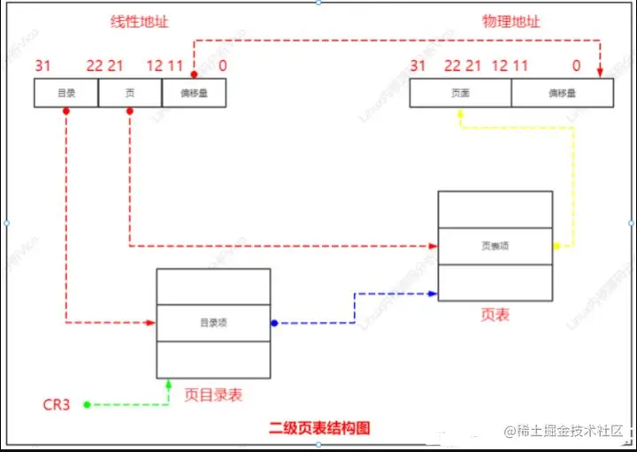 - 从奔腾处理器起,Intel微处理器引进扩展分页,允许页的大小为4MB。在扩展分页的情况下,分页机制把32位线性地址分成两域:最高10位的目录域和其余22位的偏移量。具体结构图如下(32位线性地址到物理地址的转换):