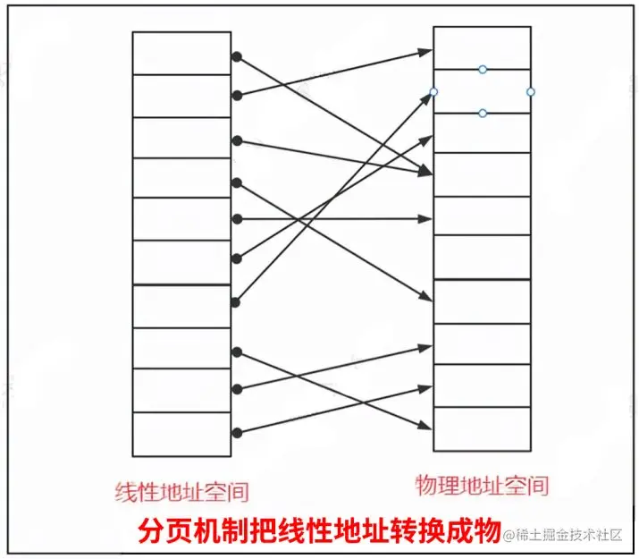 - 分页机制在段机制之后进行,以完成线性一物理地址的转换过程。段机制把逻辑地址线性,分页机制进一步把该线性地址再转换为物理地址。如果下图所示(分页机制把线性地址转换成物理地址)