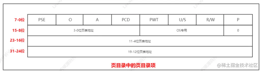 页目录表最多可包含1024个页目录项,每个页目录项为4个字节,第31-12位是20位页表地址,由于页表地址的低12位总为0,所以用高20位指出32位页表地址就OK(因此,一个页目录最多包含1024个页表地址)。第0位是存在位,如果p=1,表示页表地址指向的该页在内存中,如果p=0,表示不在内存中。第1位是读/写位。第2位是用户/管理位,这两位为页目录项提供硬件保护。
