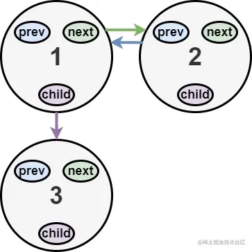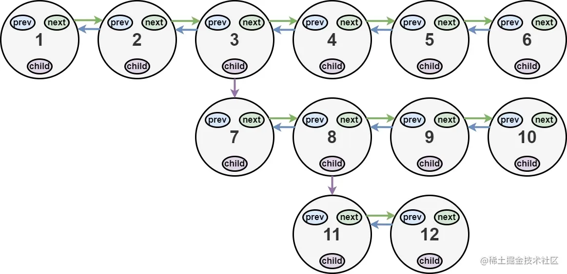 问题描述: 你会得到一个双链表,其中包含的节点有一个下一个指针、一个前一个指针和一个额外的 子指针 。这个子指针可能指向一个单独的双向链表,也包含这些特殊的节点。这些子列表可以有一个或多个自己的子列表,以此类推,以生成如下面的示例所示的 多层数据结构 。