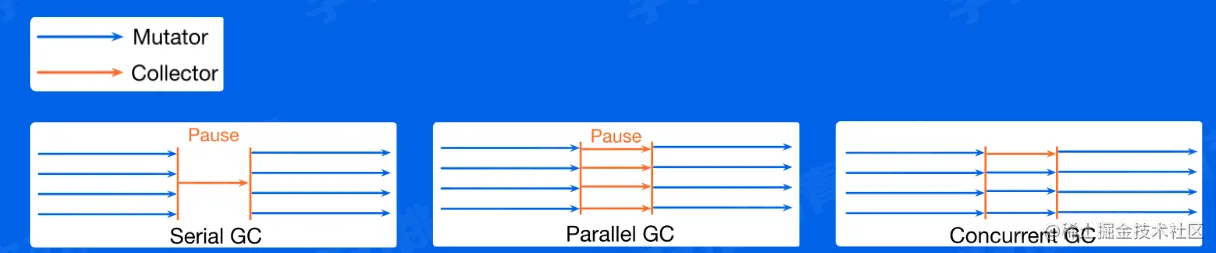 Mutator:业务线程,分配新对象,修改对象指向关系Collector:GC线程,找到存活对象,回收死亡对象的内存空间Serial GC:只有一个collectorParallel GC:支持多个collectors同时回收的GC算法Concurrent GC:mutator(s)和collector(s)可以同时执行