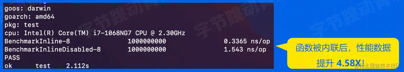 func BenchmarkInline(b *testing.B) { x := genInteger() y := genInteger() for i := 0; i < b.N; i++ { addInLine(x, y) } } func addInline(a, b int) int { return a + b }func BenchmarkInlineDisabLed(b *testing.B) { x := genInteger() y := genInteger() for i := 0; i < b.N; i++ { addNoIntine(x, y) } } //go :noinline func addNoInLine(a, b int) int { return a + b }