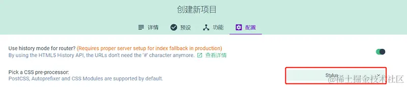 接下来 CSS pre-processor 选择 stylus,然后点击创建项目。会弹出保存预设,这里选择‘创建项目,不保存预设’即可。\