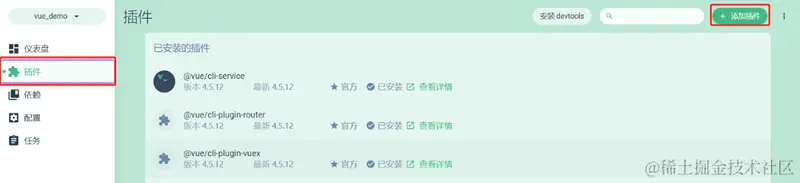Vue Web 端有下载插件的功能,点击下图的插件,然后点击添加插件。\