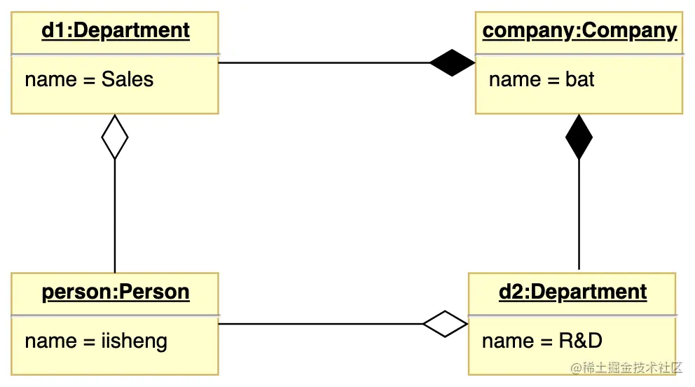 ❝一个公司拥有多个部门,公司和部门之间是组合关系,公司没了,部门没了。部门和员工是聚合关系,部门被裁掉,员工就换下家了。 ❞
