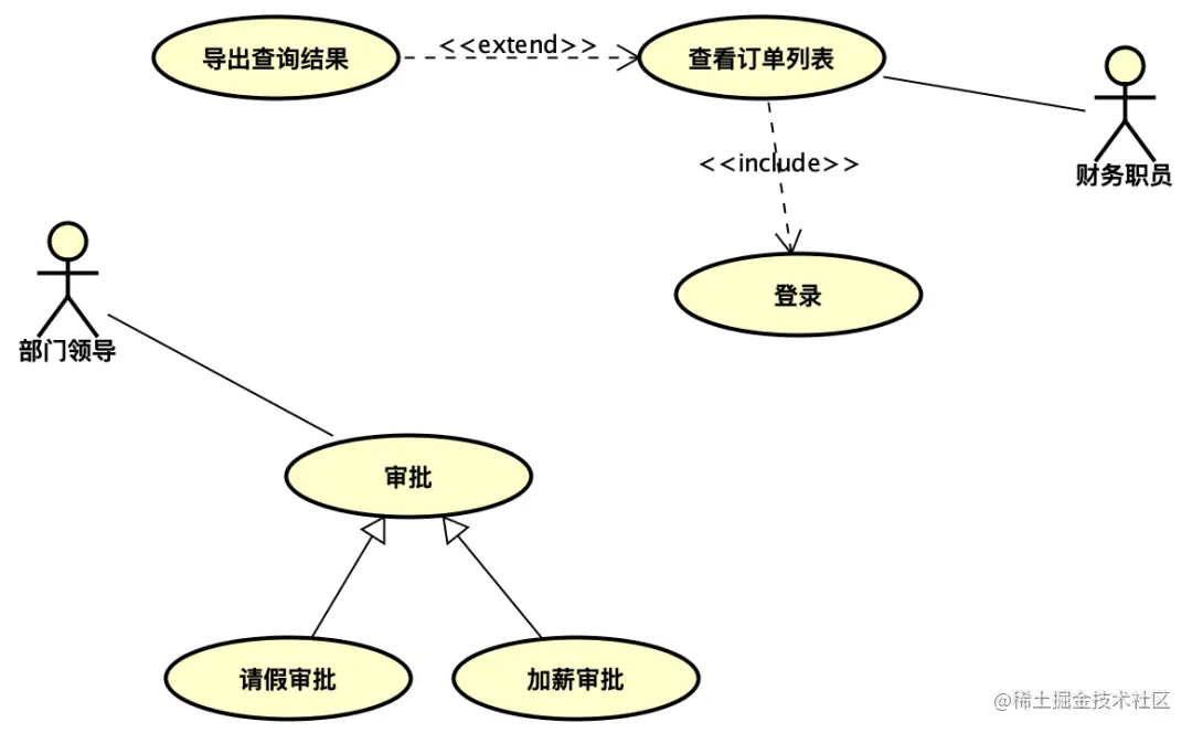 - 扩展关系使用符号《extend》,基于查询订单列表的功能,可以增加一个导出数据的功能。带箭头的虚线+《extend》字样,箭头由扩展用例指向基础用例。