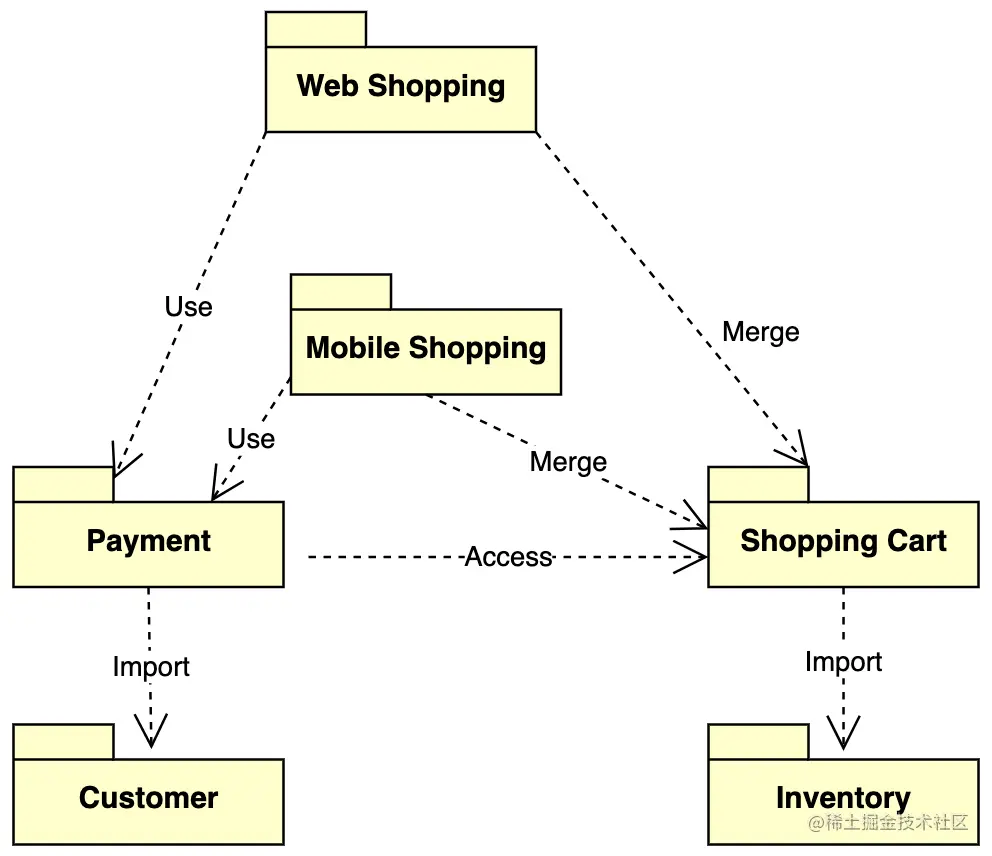 Web Shopping合并了Shopping Cart就拥有了Shopping Cart的功能 - 《Access》关系表示私有引入,比如代码中的指定包名类名