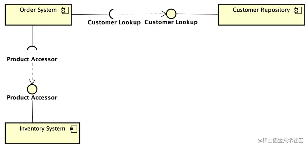 ❝订单系统组件依赖于客户资源库和库存系统组件。中间的虚线箭头表示依赖关系。另外两个符号,表示组件连接器,后一个为供接口,前一个需接口。