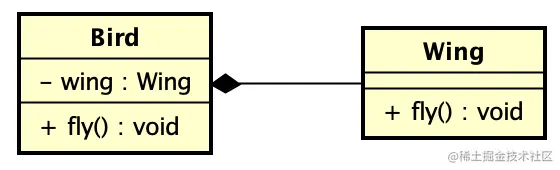 - 【箭头指向】:带实心菱形的实线,实心菱形指向整体。