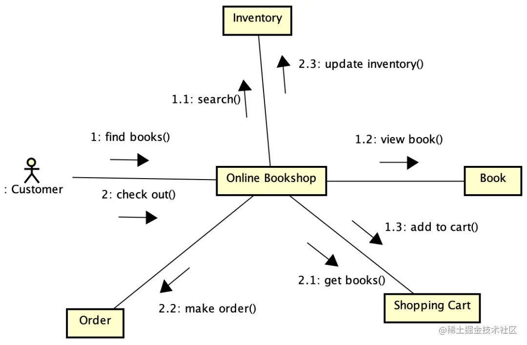 ❝图中展示了一个线上书店的通讯图,方框和小人表示生命线,不同生命线之间可以传递消息,消息前面的数字可以表达序列顺序。 ❞