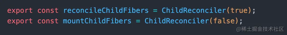 mountChildFibers和reconcileChildFibers方法调用的都是ChildReconciler这是调用的时候传递的boolean不同