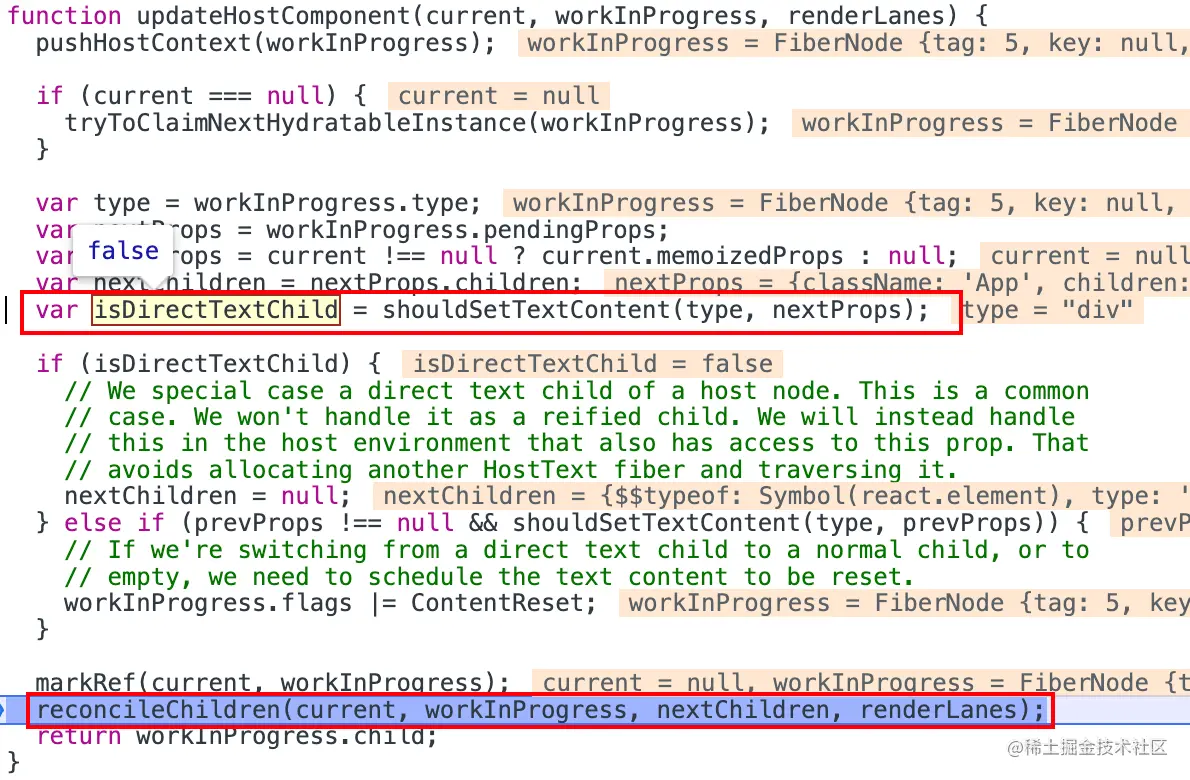 updateHostComponent方法返回一个workInProgress.child,当reconcileChildren没有执行时,workInProgress.child为null,所以reconcileChildren会为当前workInProgress创建一个child节点。