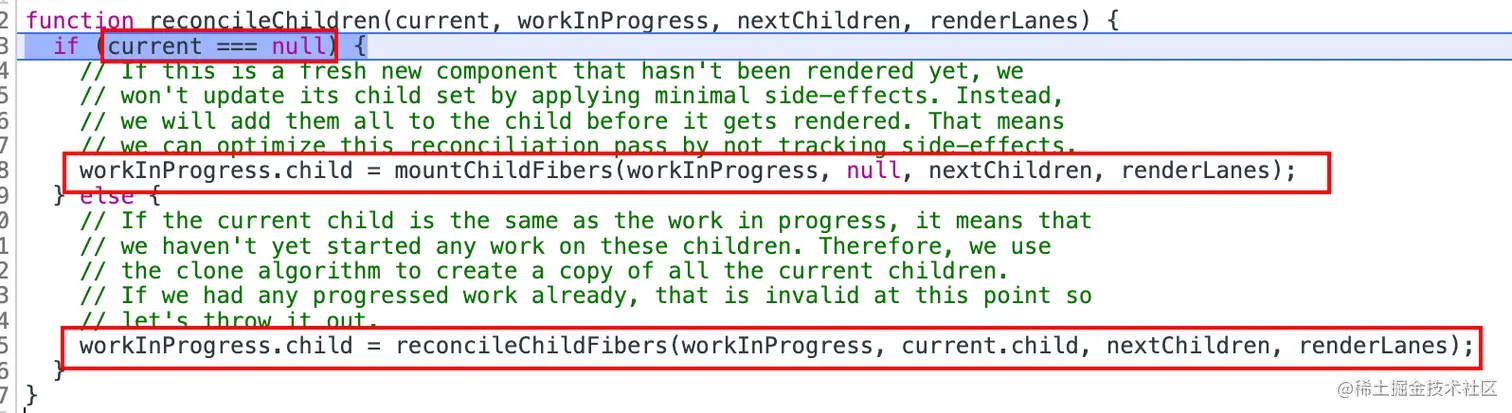 reconcileChildren方法通过判断current === null进入mountChildFibers还是reconcileChildFibers