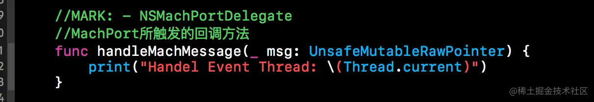 搞定NSMachPort对象后,接下来我们要在当前VC实现NSMachPortDelegate代理中相关的方法,如下所示。当在其他线程中调用上述的MachPort对象发送消息时,会在主线程中执行下方的代理方法。在该方法中我们打印了该方法执行时所在的线程,具体代码如下所示: