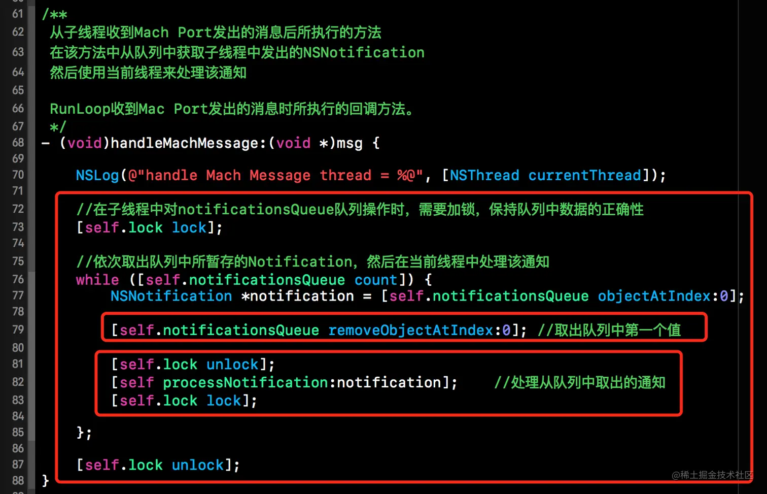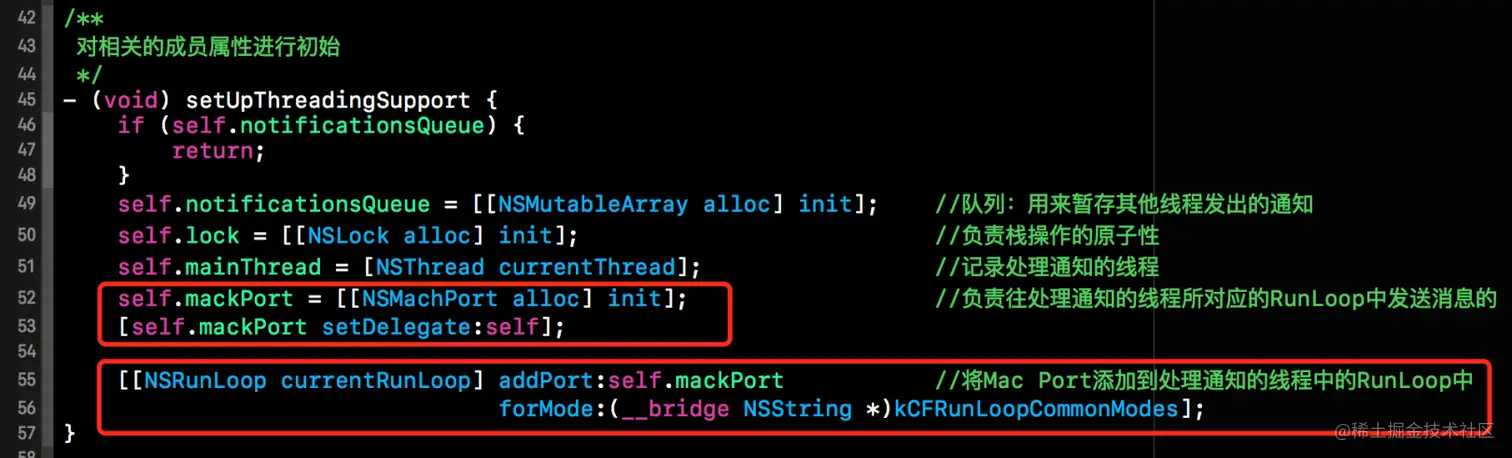 首先还是得实现NSMachPortDelegate相关协议中的方法,下方代码段中的notificationQueue用来纯粹子线程发出的所有通知,mainThread则是用来储存主线程了,lock则是对通知队列加锁,避免多个线程同时操作该队列所出现的数据不一致问题。mackPort则是用于向期望线程发送信号的通信端口。