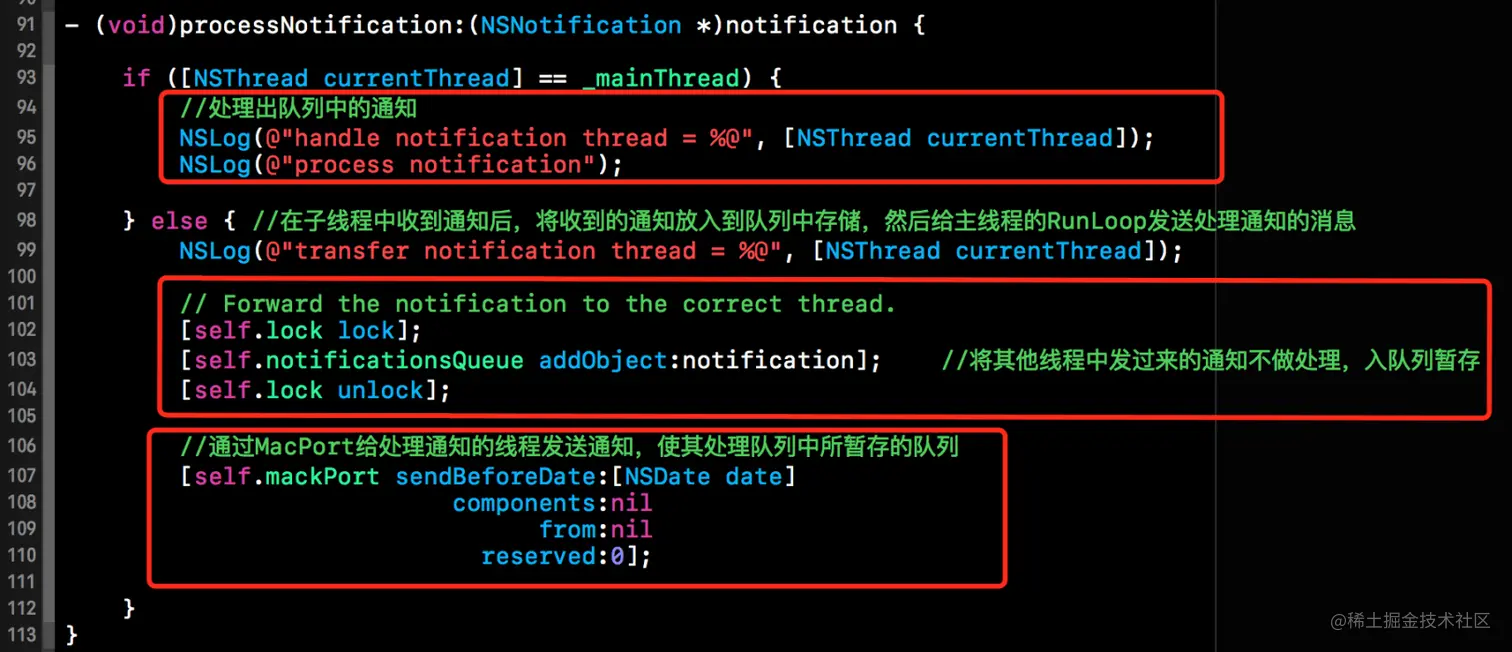 下方就是收到通知后所执行的方法,在该方法中,我们看到做了一个判断。如果该方法是在我们预期的主线程中被执行的话,那么我们就执行收到通知后所要执行的任务。如果不是我们预期的主线程的话,接下来走的就是通过MachPort来转发到主线程了。