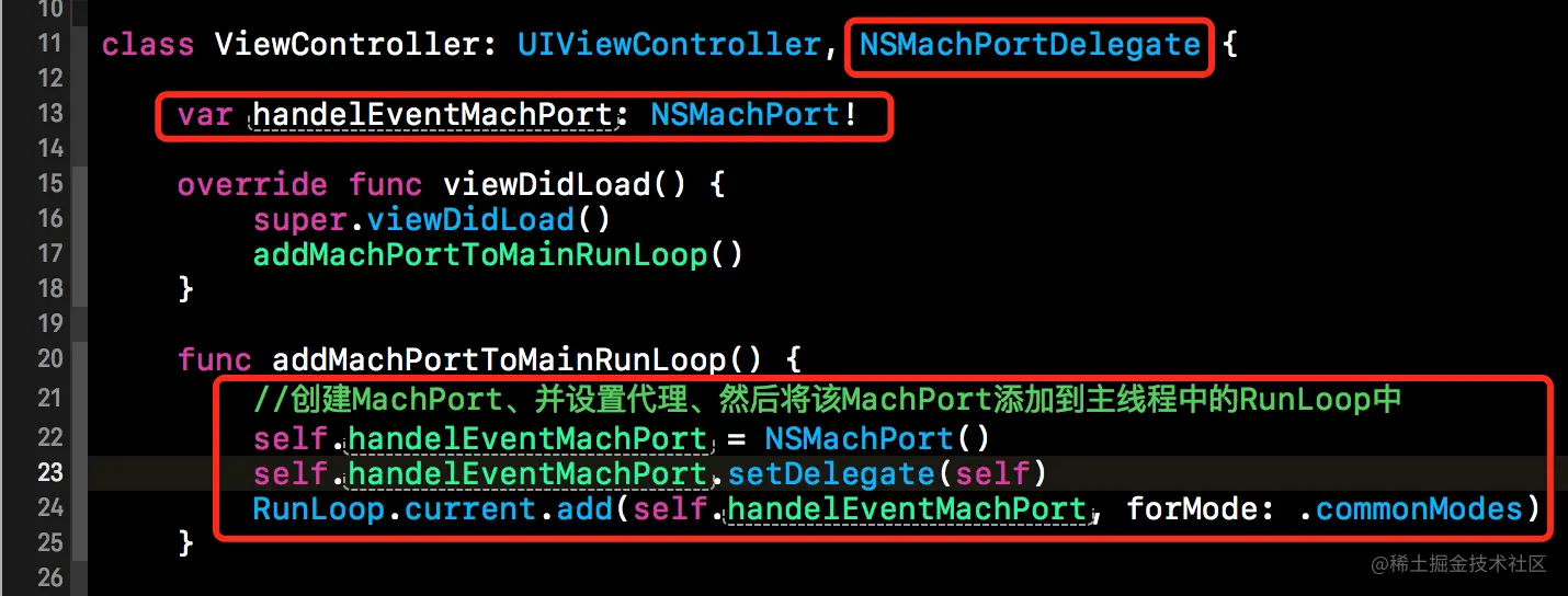 接下来我们就通过一个小的示例来简单的看一下MachPort的使用方式。首先我们声明了一个NSMachPort的成员属性handelEventMachPort,该变量实例化后指定其NSMachPortDelegate的对象为当前类。然后将handelEventMachPort添加到主线程中,具体代码如下所示。
