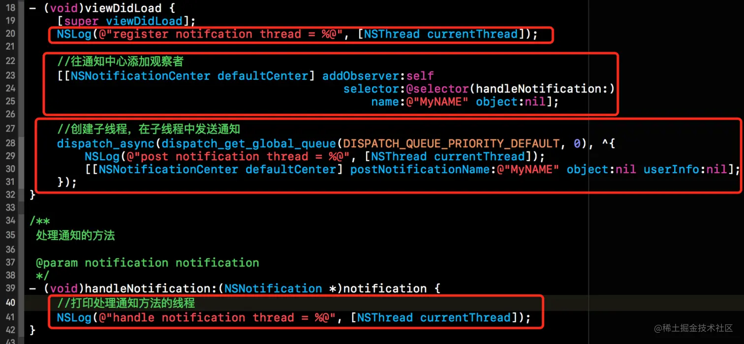 下方就是本部分的核心代码,代码比较简单。首先我们打印出注册观察者的线程,然后往通知中心添加观察者。紧接着我们就创建一个子线程,然后对子线程的信息进行打印并获取通知中心单例发送通知。