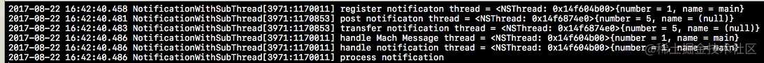 实现完上述代码后,下方是上述代码的运行结果。从结果中我们不难发现,虽然是在主线程中添加的观察者,但是如果在子线程中发出通知,那么就在该子线程中处理通知所关联的方法,具体效果如下所示: