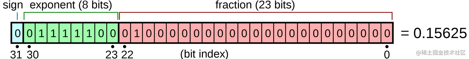 0.15625转换为二进制数是0.00101,用科学计数法表示就是 1.01 * 2^(-3),所以符号位为0,表示该数为正。注意,接下来的8位并不直接存储指数-3,而是存储阶数,阶数定义如下: