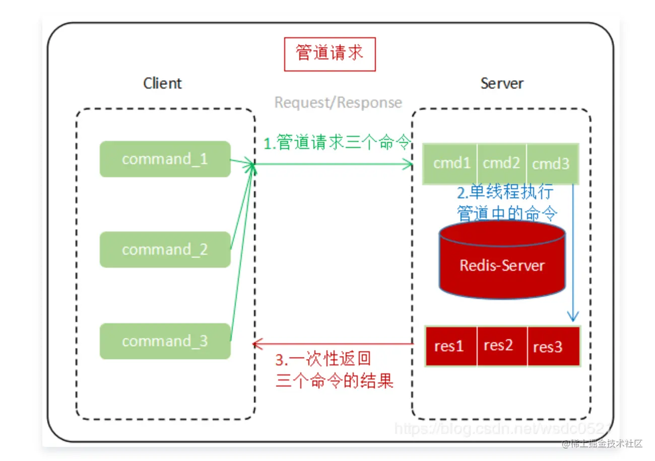 Redis 的底层通信协议对管道(Pipelineing)提供了支持。通过管道可以一次性发送多条命令并在执行完后一次性将结果返回。当一组命令中每条命令都不依赖于之前命令的执行结果时就可以将这组命令一起通过管道发出。