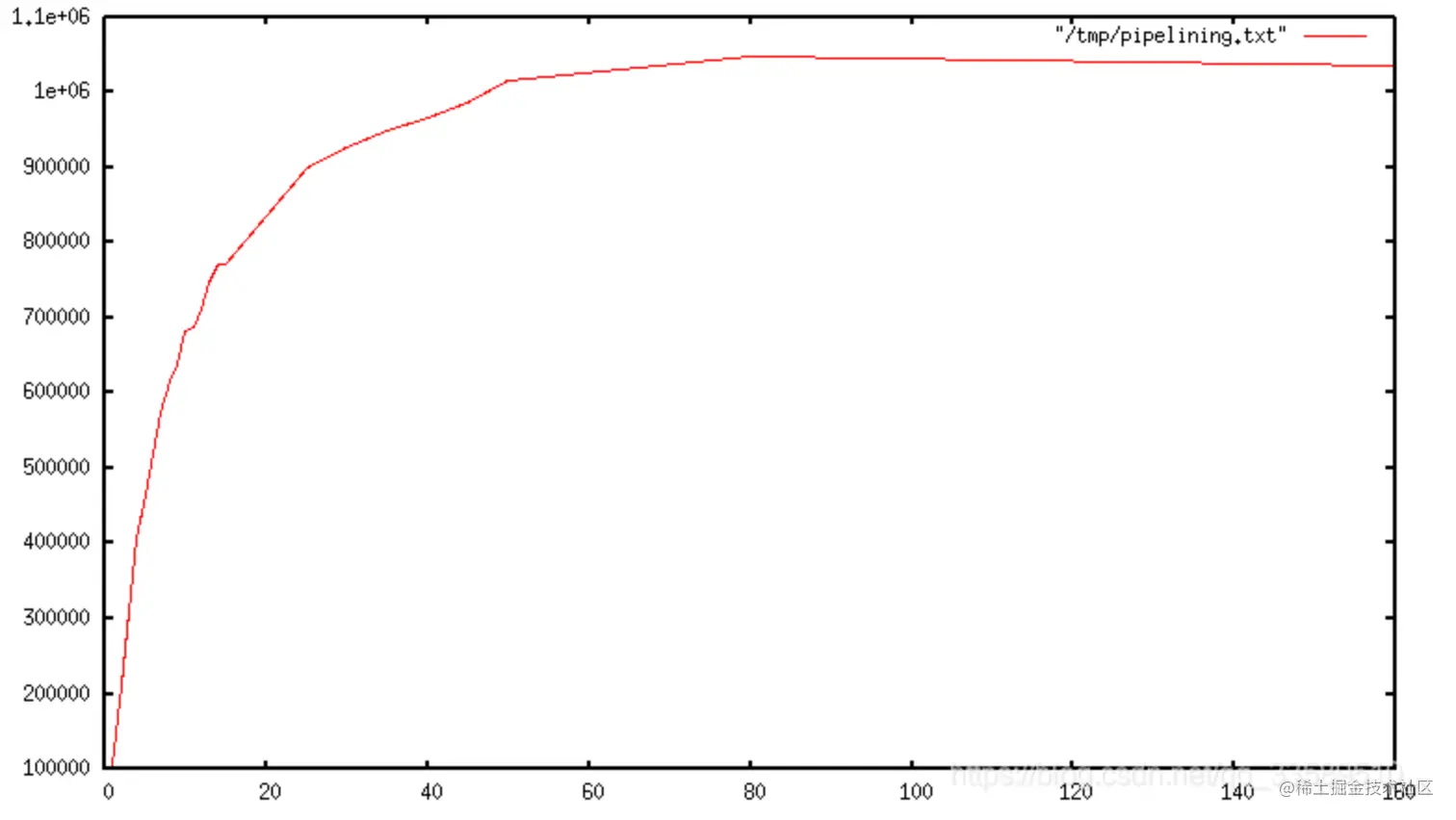 使用管道(Pipelineing)时,通常使用单个 read 系统调用读取许多命令,并且通过单个 write 系统调用传递多个答复。因此,每秒执行的总查询数最初随着较长的管道而几乎呈线性增加,最终可达到不使用流水线获得的基准的 10 倍左右,如下图所示。