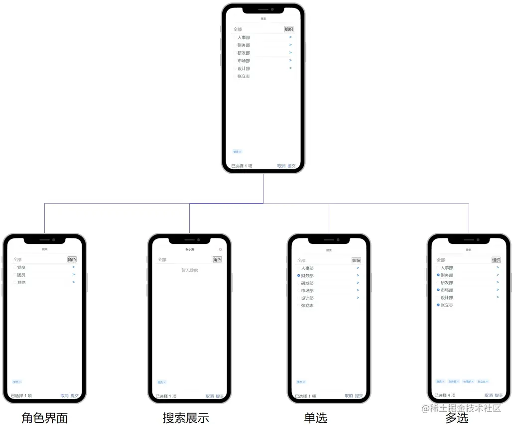 移动端组织架构数据选择方案,包括组织机构、角色以及人员等分类,支持单选、多选、关键字段自定义以及多种事件及插槽等,适用于大部分组织选人场景。