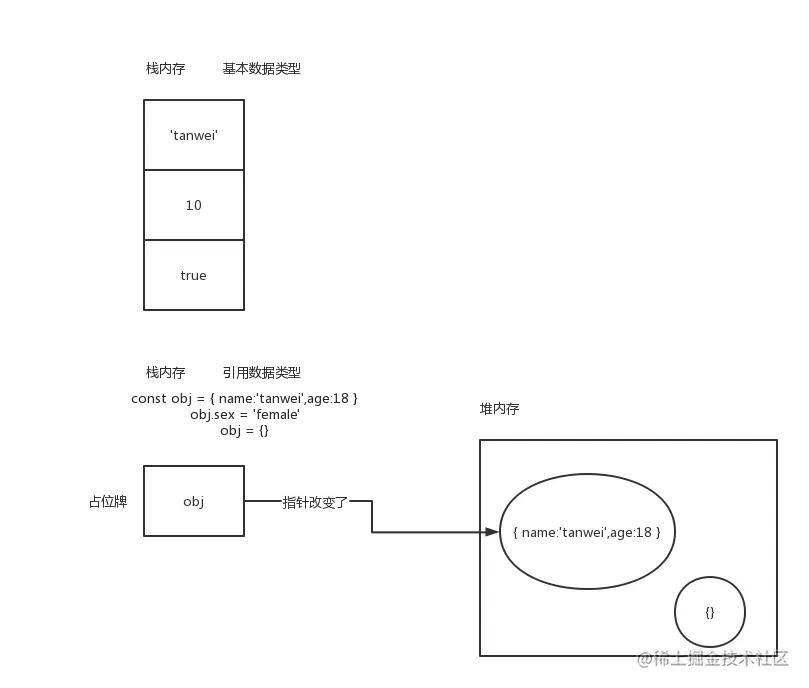 obj.name = 'tan' // 不报错,内存指针未变,只改变了内存里的属性