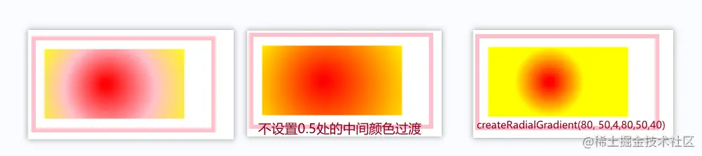 createRadialGradient(x,y,r,x1,y1,r1):创建一个径向/圆渐变x:渐变的开始圆的 x 坐标y:渐变的开始圆的 y 坐标r:开始圆的半径x1:渐变的结束圆的 x 坐标y1:渐变的结束圆的 y 坐标r1:结束圆的半径