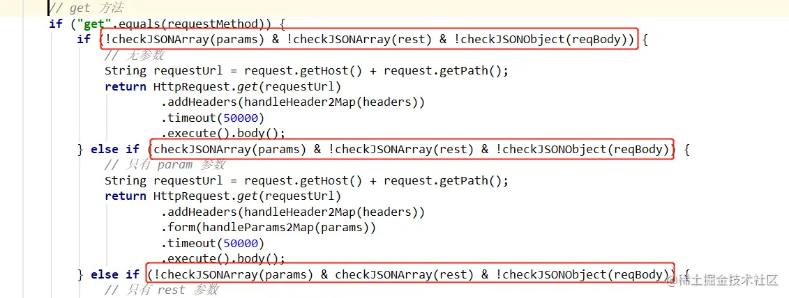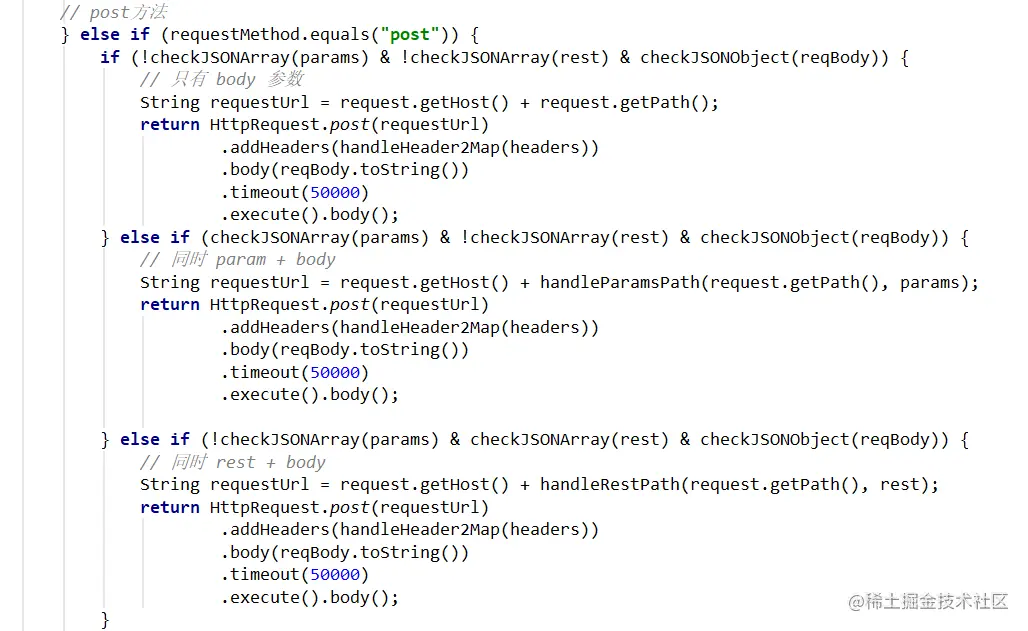 这里要注意的是,在hutool的 http 客户端中,我入参使用body()的时候会把form()的参数覆盖掉,所以在处理请求体参数组合的情况下,只能把查询参数或者路径参数,都处理在请求 url 上。比如,这里是为了处理param+body的组合,手动把param参数拼接到 url 上。