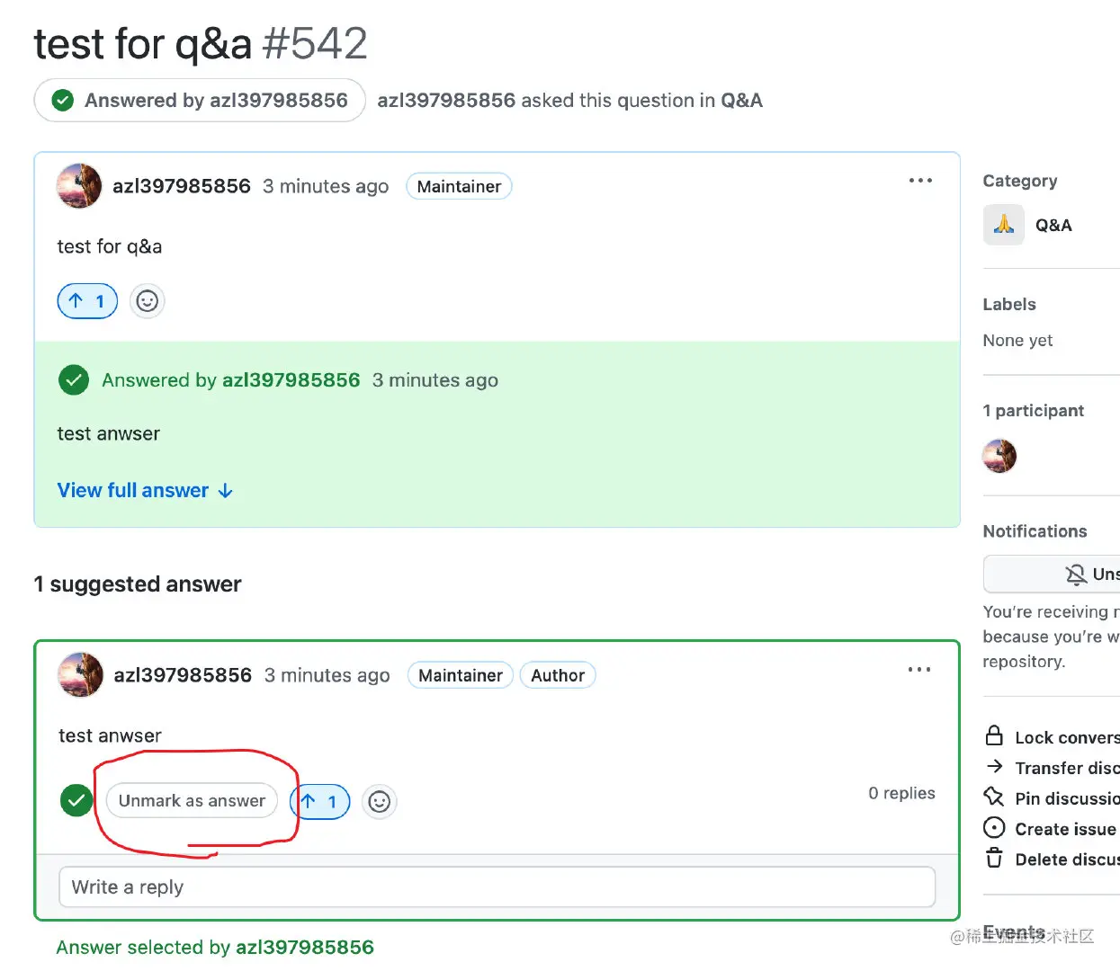 近期 Github 还给 Disscussion 提供了问答社区才有的功能 - 选为答案。